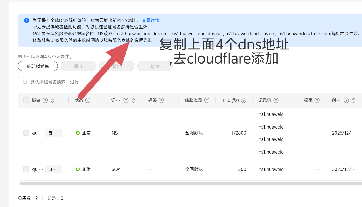 添加完成后,华为云会提供一组 NS 记录。接下来需要前往 Cloudflare,将这组 NS 记录配置进去,把该子域名的解析权交给华为云。