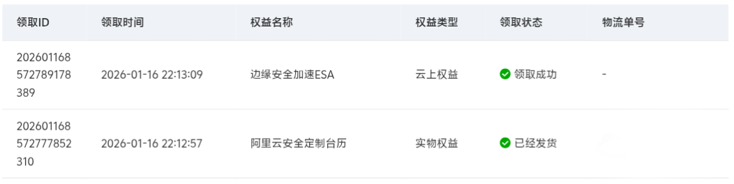领取完成之后,可以点击权益页面右上角的 领取记录 查看当前状态。